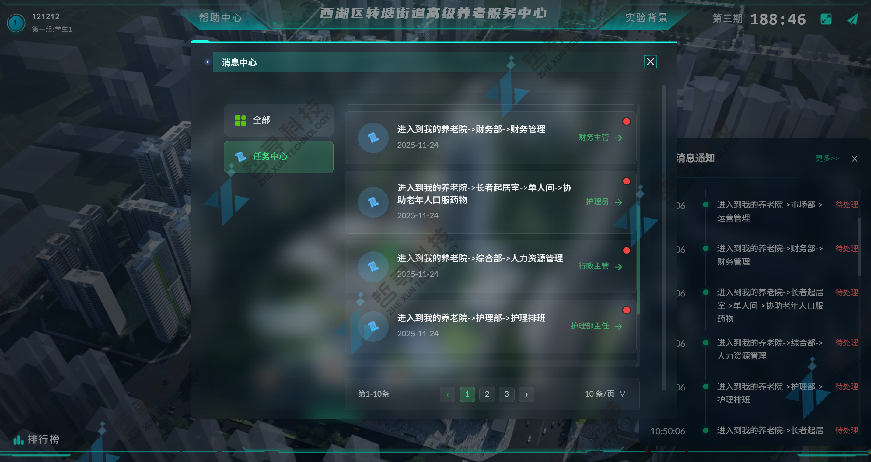 平台运用先进的系统架构,实现不同角色部门的职业身份快速切换。通过设立流程任务和对应节点的风险事件,模拟真实工作场景。学生可以熟悉岗位制度、处理岗位日常工作、应对特殊事件,深入了解不同岗位的工作内容和职责,掌握不同规模的养老院组织架构,盈利模式,提升对工作和职业的认知,增强学习成就感,激发探索高阶管理策略的热情。