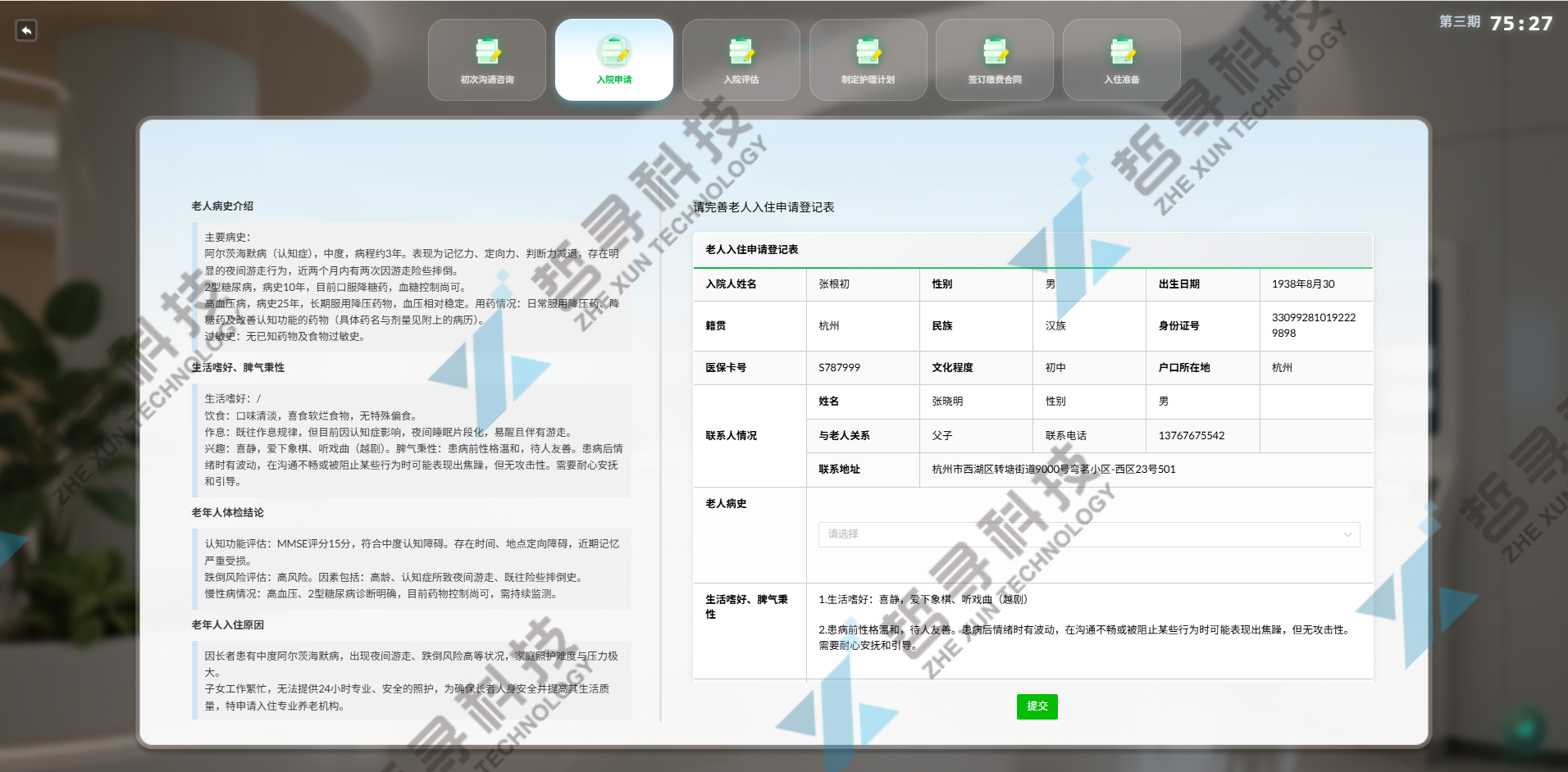 平台专注于培养学生“从评估到方案产出”的核心专业素质能力。学生通过模拟标准化流程、观察与分析养老机构及老年人的核心监测数据,提升数据敏锐度与问题诊断能力,从而缩短从理论到实践的适应周期。平台支持嵌入丰富的情景化案例与故事情节,将团队成员、长者个案、机构背景有机串联,在高度仿真的复杂关系中锻炼学生的综合判断与协作能力。